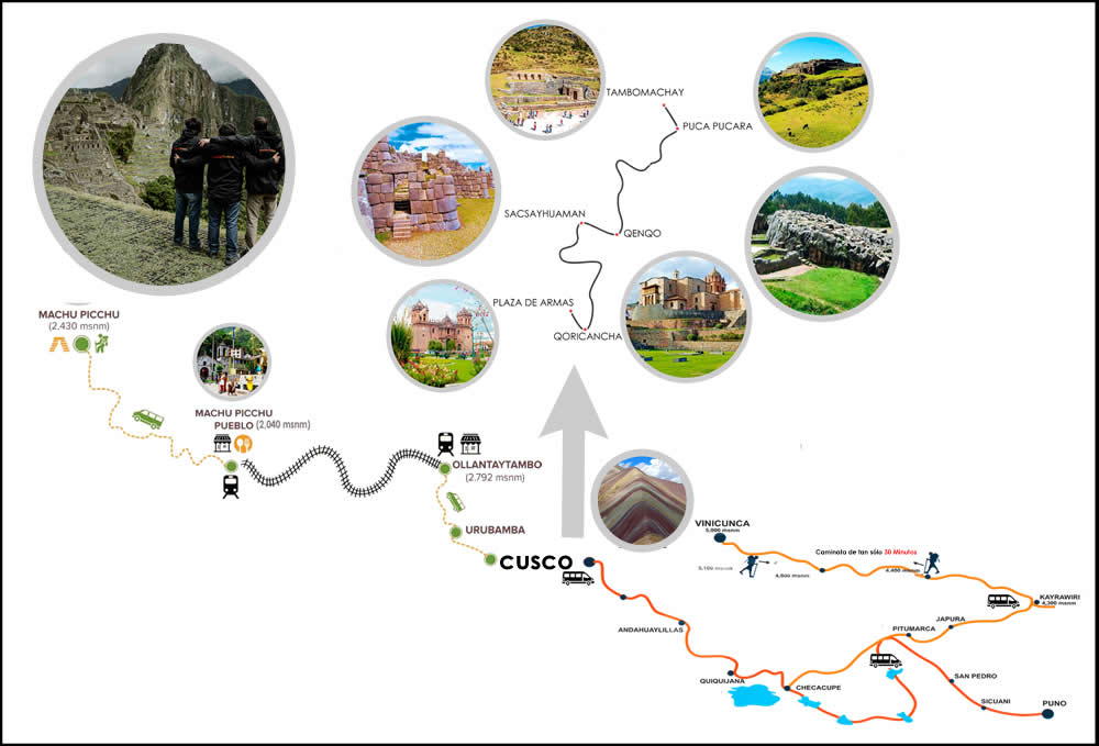 This program includes visits to the most representative places in the city of Cusco, such as Sacsayhuaman, Qenqo, Pucapucara, Tambomachay. Visit one of the seven new wonders of the world, Machu Picchu, where we will also visit its small town located between giant mountains, Aguas Calientes. It also includes Rainbow Mountain, the 7-color mountain hike. Contact us now!